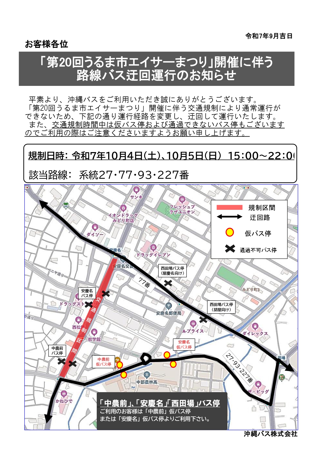 【お知らせ】第20回うるま市エイサーまつりに伴う路線バス迂回運行について